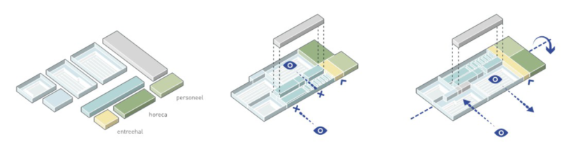 Door de verdraaiing van de programmablokjes, welke is ingegeven door de solitaire bomen in het plangebied, ontstaat er een spannend interieurlandschap. De massieve blokken in de open ruimten zorgen ervoor dat er steeds iets nieuws te ontdekken is